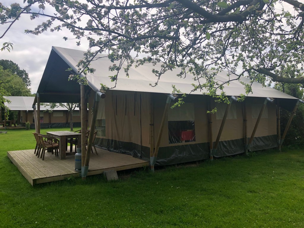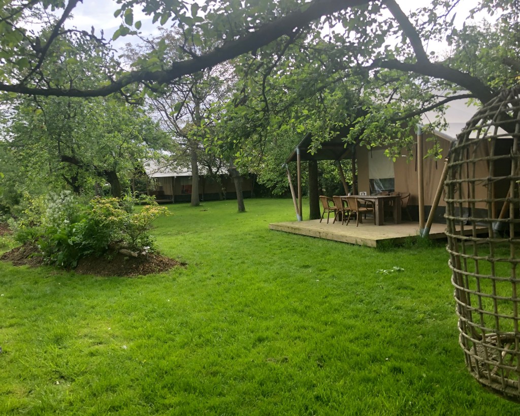Twee dagen later reed ik weer door de Westerscheldetunnel. Dit maal naar Graauw, naar Emiel van de Vijver van Voedselbron Graauw. Een van de projecten waar ik aan mee mag werken. De afspraak van vandaag was niet zo spannend; we zouden het gaan hebben over het verloop en de afhandeling van de (Europese) subsidie. Maar…. er was tijd om ook een bezoekje aan het voedselbos te brengen en WOW, wat is het toch gaaf daar! Het Voedselbos groeit hartstikke goed en er zijn lekkere, aparte dingen te ontdekken. Zo heb ik heerlijke blaadjes gegeten met super-smaken (helaas ben ik de namen vergeten, er stonden geen kaartjes bij… 😊) en heb ik een prachtige, hele grote en zeer smakelijke shiitake paddenstoel meegekregen. En dan die safari tenten! Hier ga ik écht een keer zelf ervaren hoe het is om in het voedselbos te overnachten!